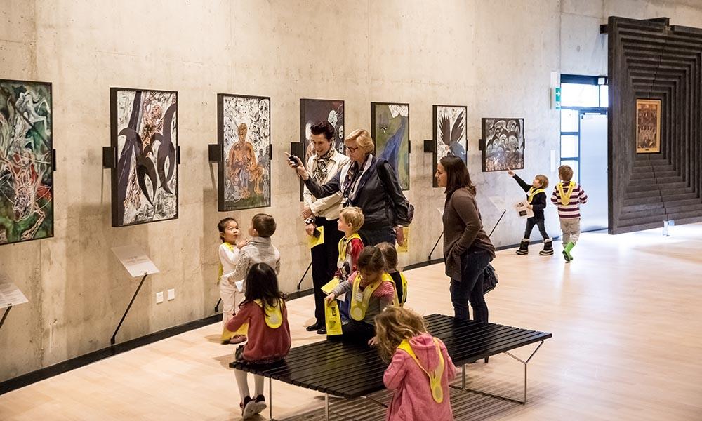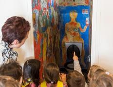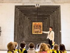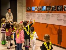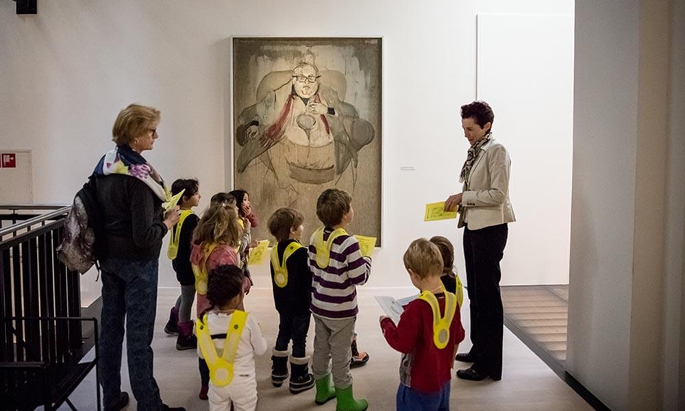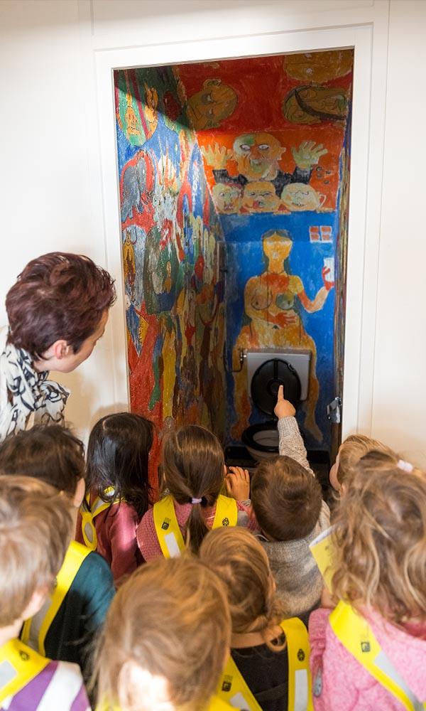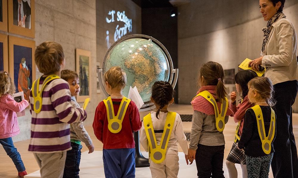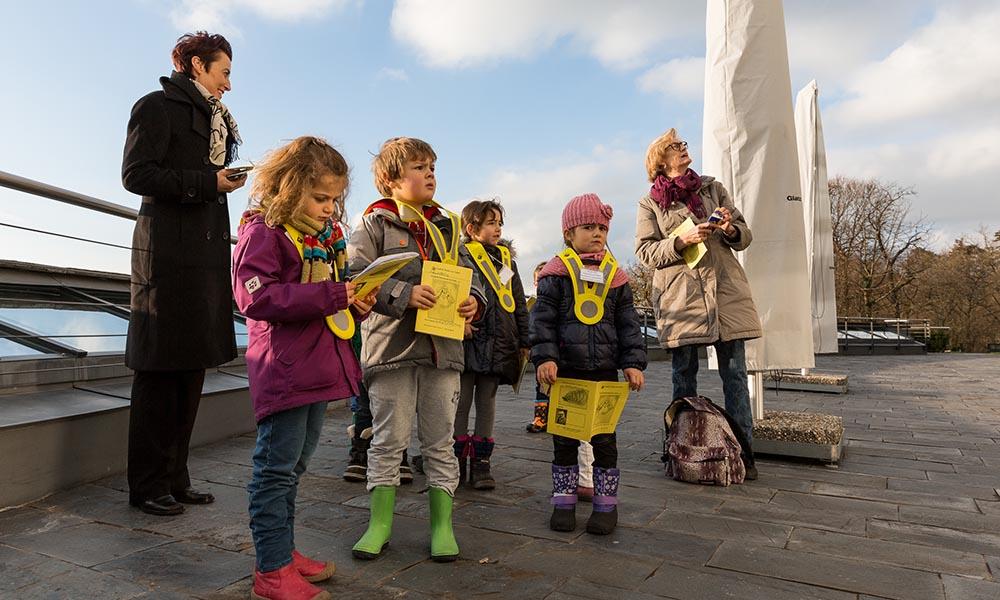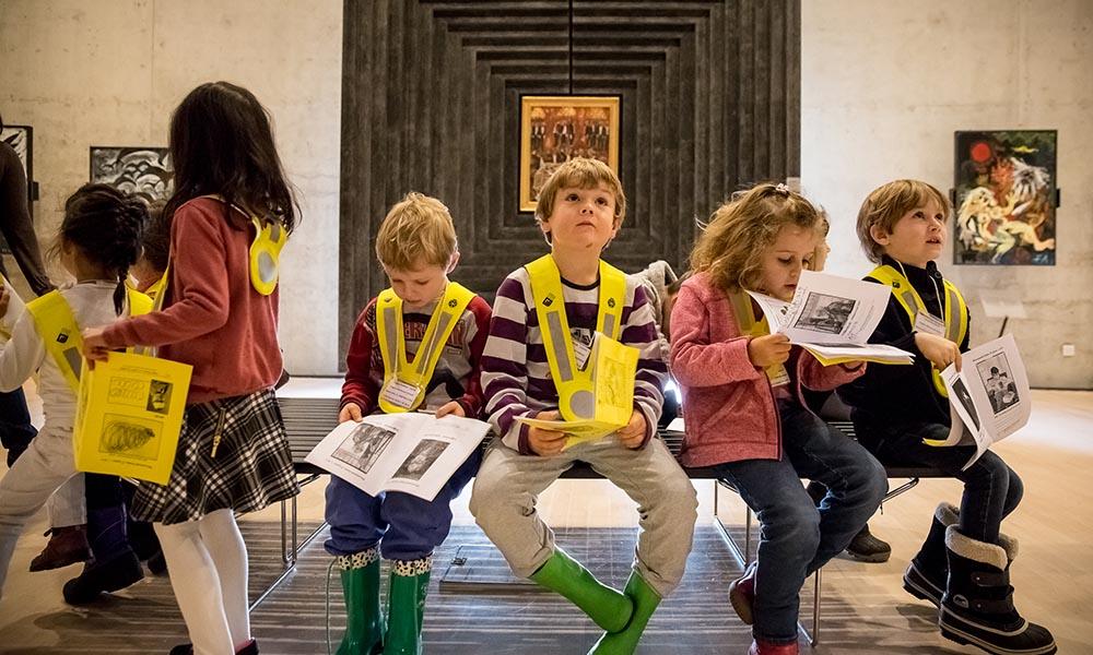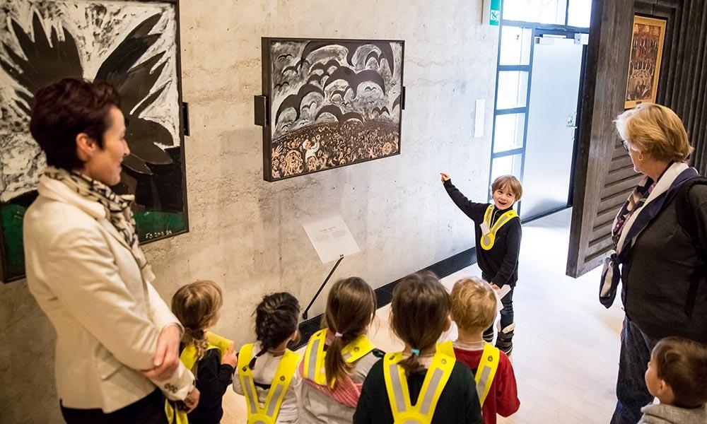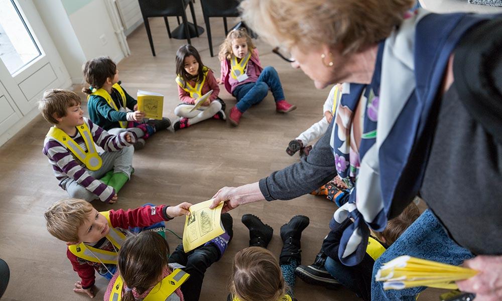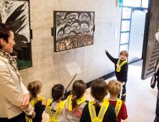 Impressions d'Elisabeth Houweling: We had a superb morning and we started on a beautiful terrace of Centre Dürrenmatt with a blue sky, sunshine and a clear view on Neuchâtel. Ms Madeleine BETSCHART, Director Centre Dürrenmatt showed the house of Friedrich Dürrenmatt and pointed out where Friedrich’s room was and the room of Charlotte, his second wife (his first wife died). She could show too where Mario BOTTA (The architect of Centre Dürrenmatt) started connecting the Centre/Museum with the old house. Children knew everything about the architect and when Ms Betschart asked who the architect of Centre Dürrenmatt was they all answered: “Mario BOTTA”! And she was very pleased. We visited the photo gallery of Dürrenmatt where children recognized many photos from their little book like Dürrenmatt with the parrot (this is their favorite picture!). And a young Dürrenmatt of which some children thought it was his father. After 3 quarters of an hour the concentration span of children diminished and we had planned a snack and drink in the restaurant of the Museum. Well it was bread and chocolate so this break was very successful.