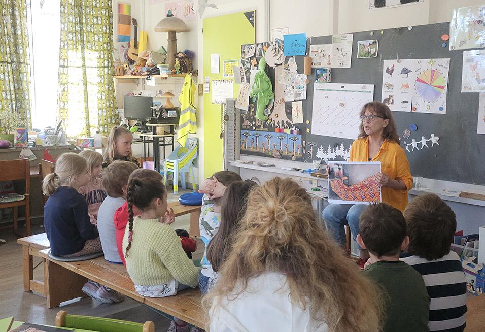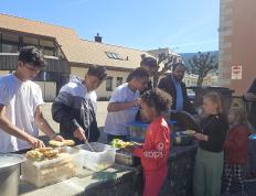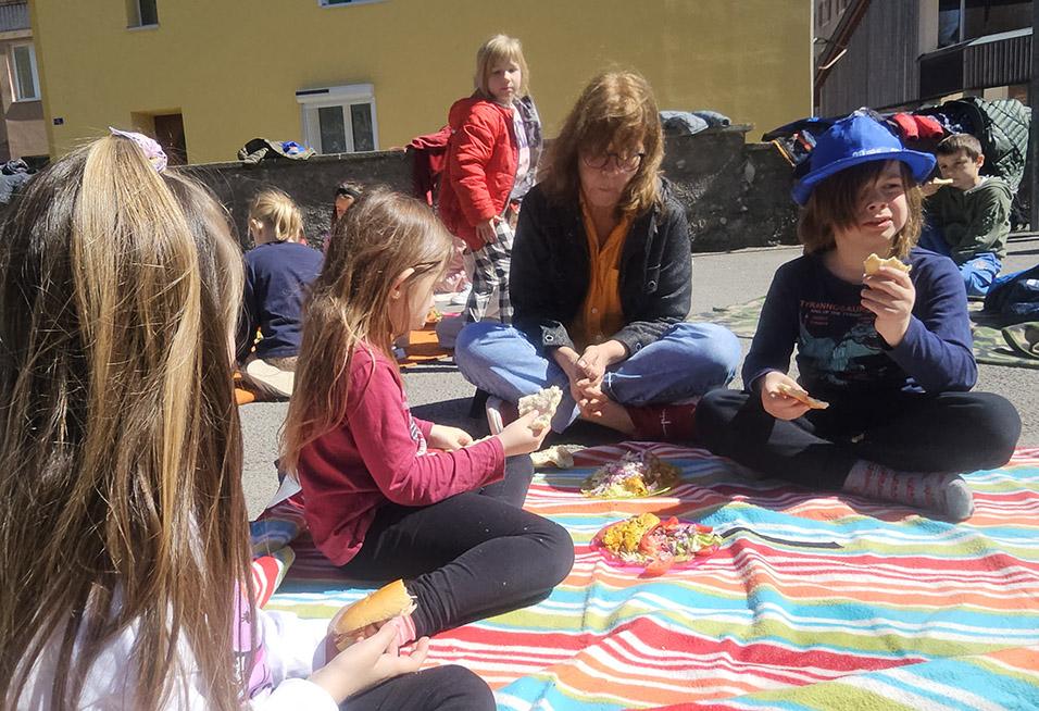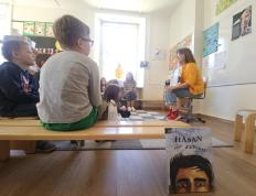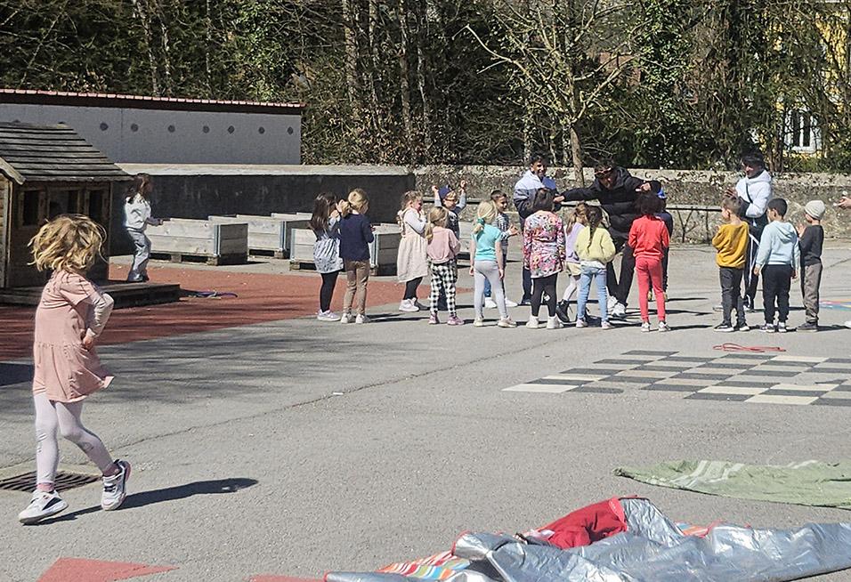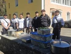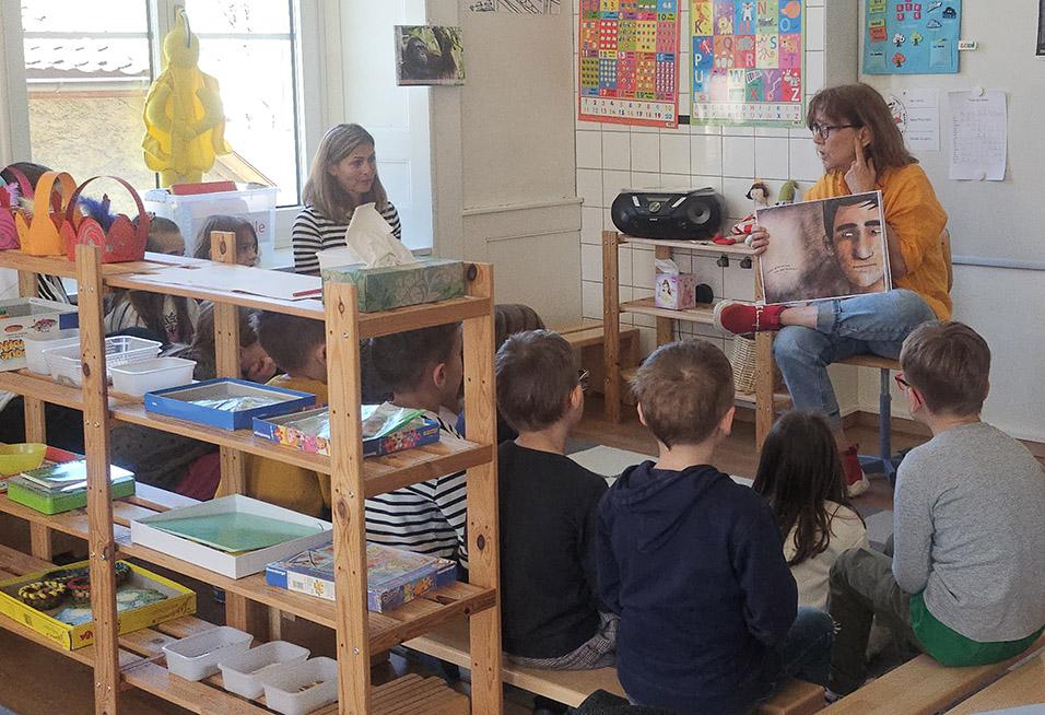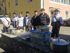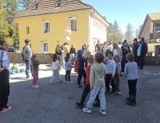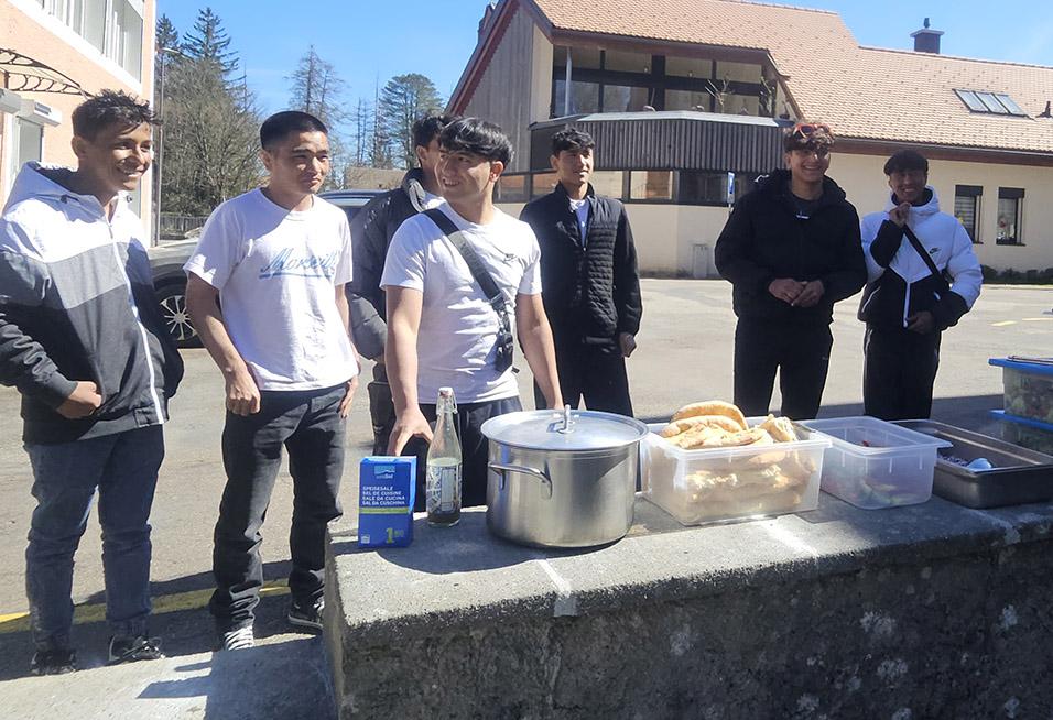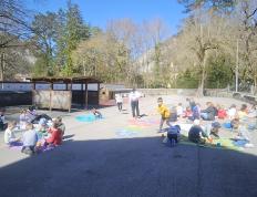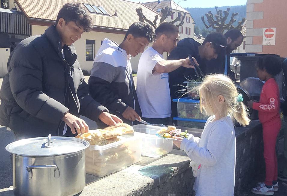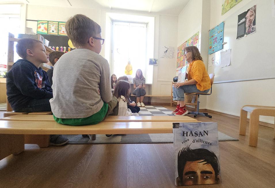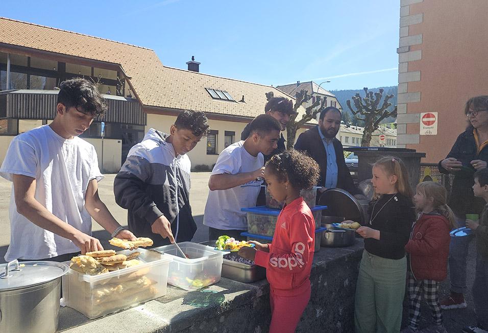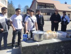 Jeudi 10 avril. Les élèves du Collège du Temple Fleurier rencontrent Mary Wenker autour du livre Hasan venu d'ailleurs. 3 Classes des enfants de 5e et 6e HP se montrent très intéressés par cet échange. La rencontre est suivie d'un repas aux saveurs afghanes, dégusté sur des couvertures installées dans la cour de l'école.