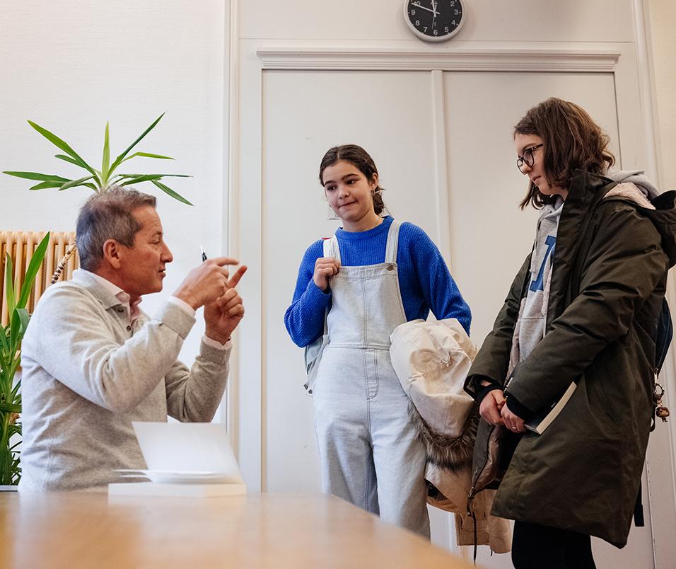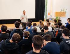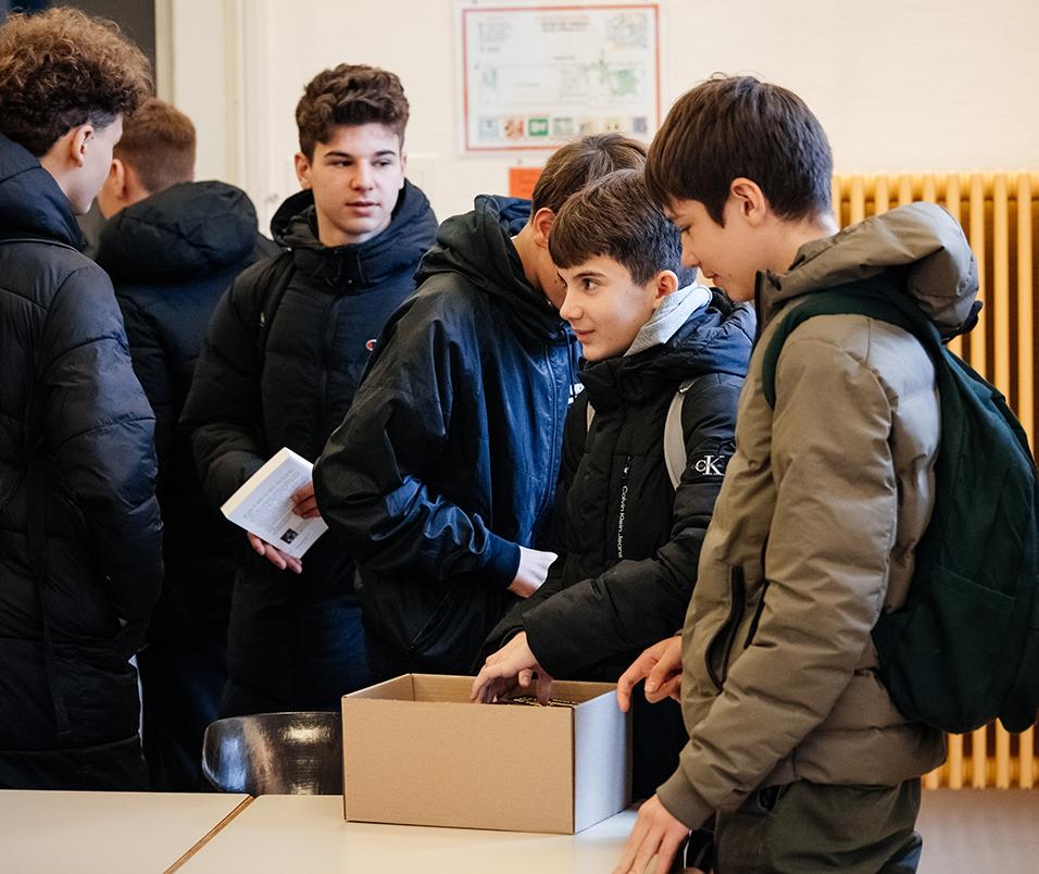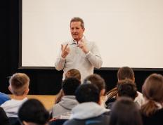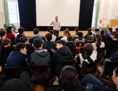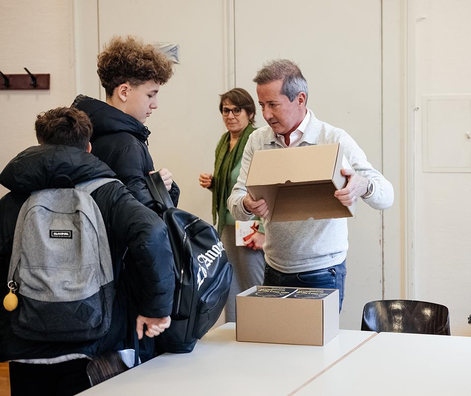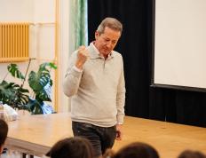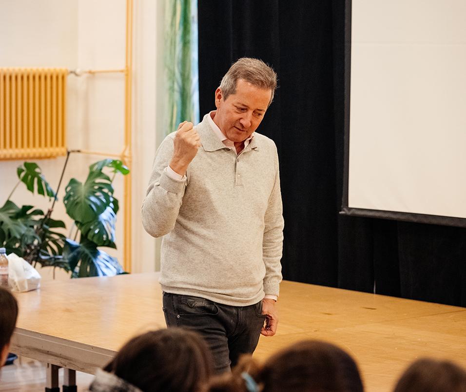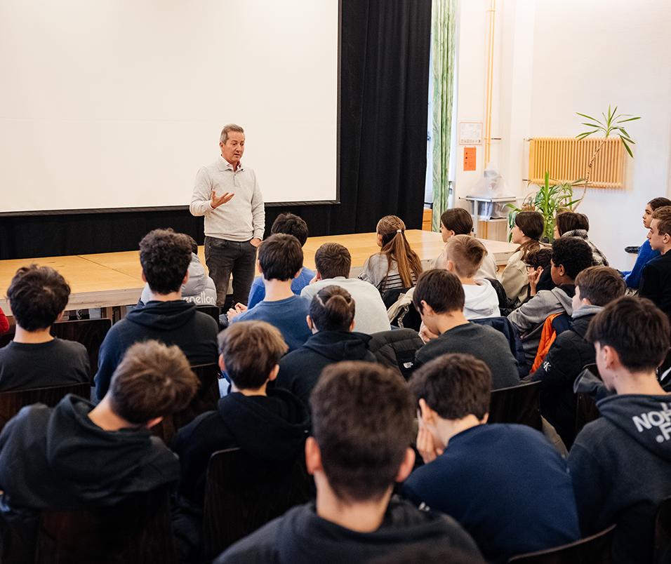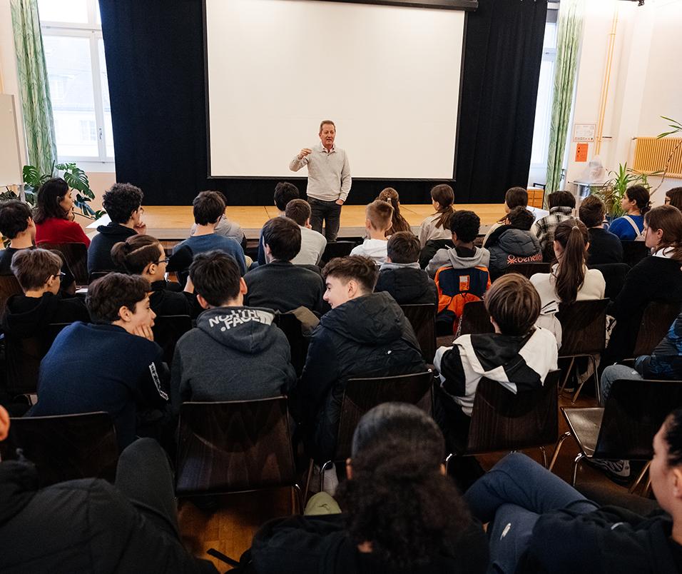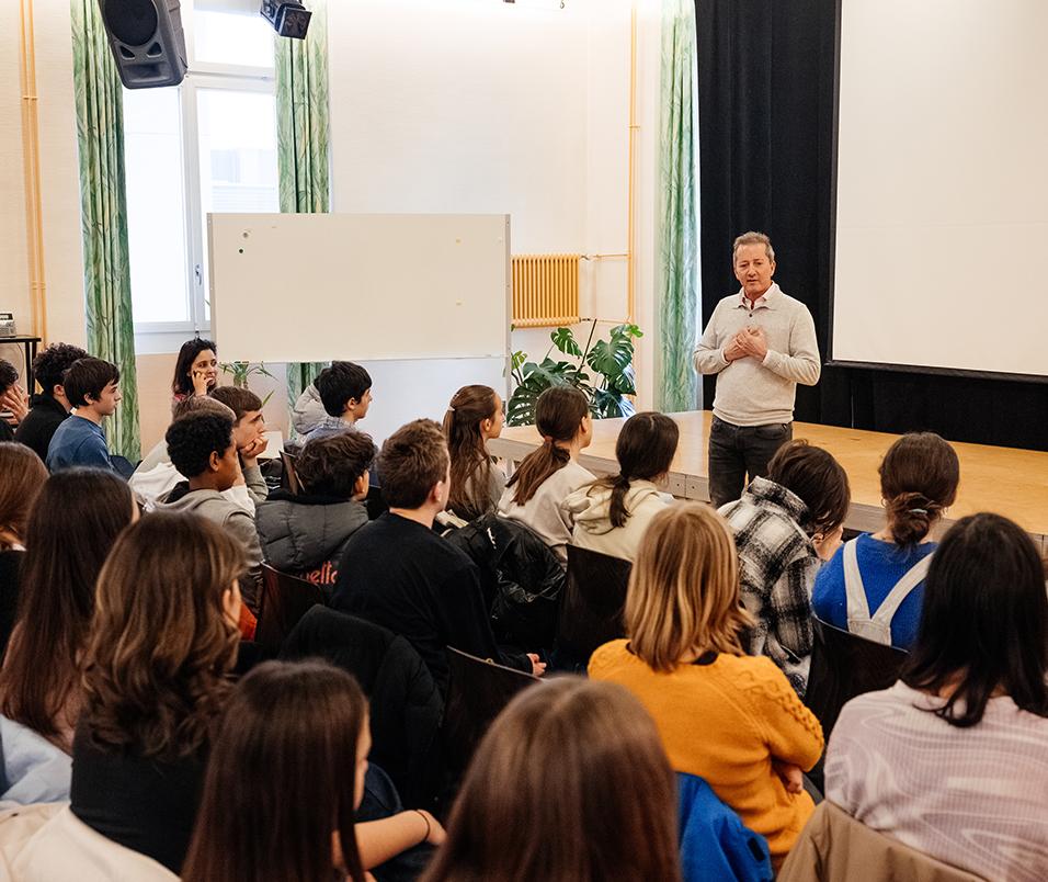 Patrick Delarive à la rencontre des collégiens et collégiennes du collège des Terreaux de Neuchâtel pour témoigner de son parcours de vie, de sa passion créative et de son roman sorti en 2022, "L’extraordinaire vie/mort du père d’Arno Morel". Au collège des Terreaux, Neuchâtel, le 26 janvier 2023.
