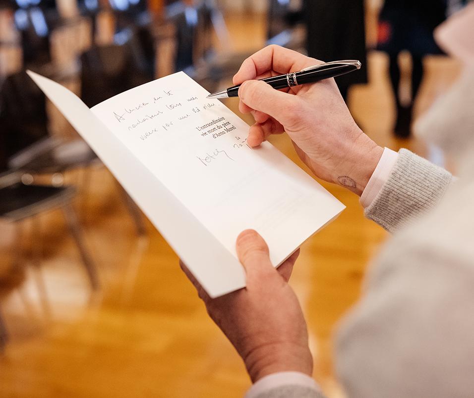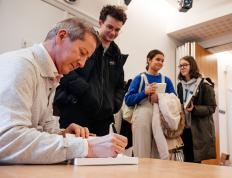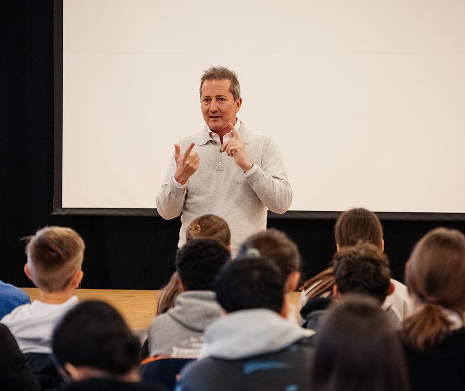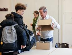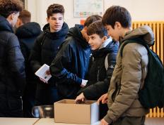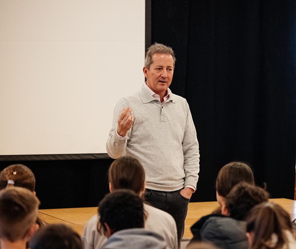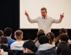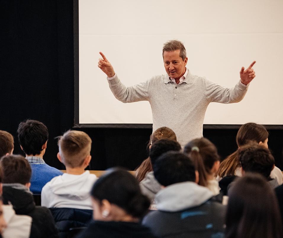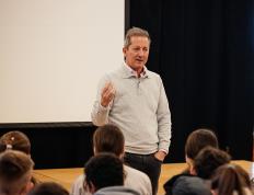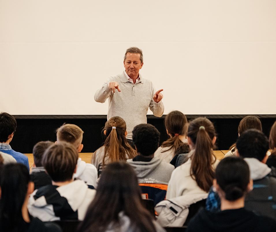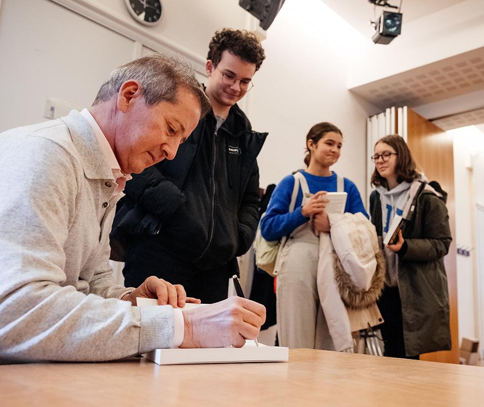 Patrick Delarive à la rencontre des collégiens et collégiennes du collège des Terreaux de Neuchâtel pour témoigner de son parcours de vie, de sa passion créative et de son roman sorti en 2022, "L’extraordinaire vie/mort du père d’Arno Morel". Au collège des Terreaux, Neuchâtel, le 26 janvier 2023.